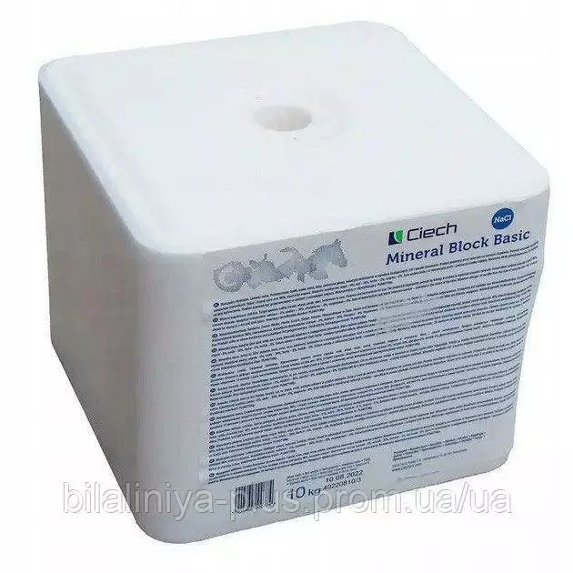 Брикетована сіль (лизунець), виробництво — Польща, торгова марка CIECH, вага одного брикету — 10 кг.Сіль відіграє важливу роль в організмі тварин: вона нейтралізує надлишкову кислотність і сприяє виробленню шлункового соку. Натрій, що міститься в солі, бере участь у підтриманні кислотно-лужного балансу крові та необхідний для нормального функціонування нервової системи.